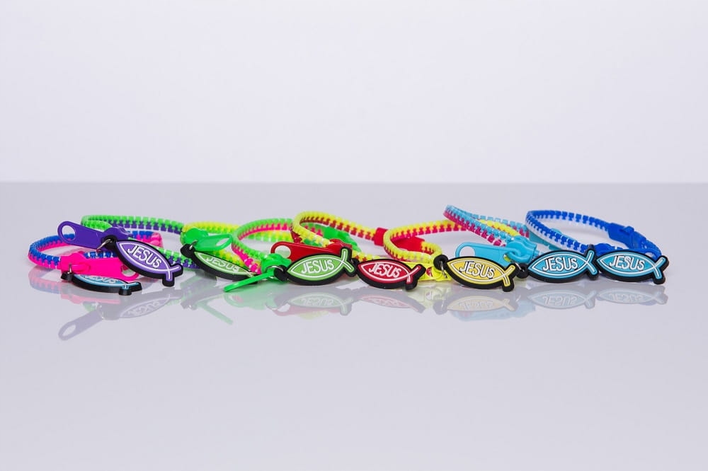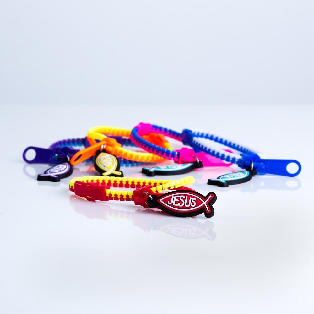 Chrześcijańska bransoletka, zapinana w postaci zamka błyskawicznego z zawieszką z rybką i napisem Jesus.