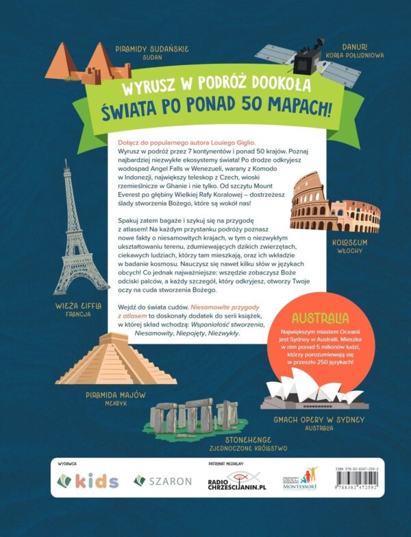 Spakuj zatem bagaże i szykuj się na przygodę z atlasem! Na każdym przystanku podróży poznasz nowe fakty o niesamowitych krajach, w tym o niezwykłym ukształtowaniu terenu, zdumiewających dzikich zwierzętach, ciekawych ludziach, którzy tam mieszkają, oraz ich wkładzie w badanie kosmosu. Nauczysz się nawet kilku słów w językach obcych! Co jednak najważniejsze: wszędzie zobaczysz Boże odciski palców, a każdy szczegół, który odkryjesz, otworzy Twoje oczy na cuda stworzenia Bożego.